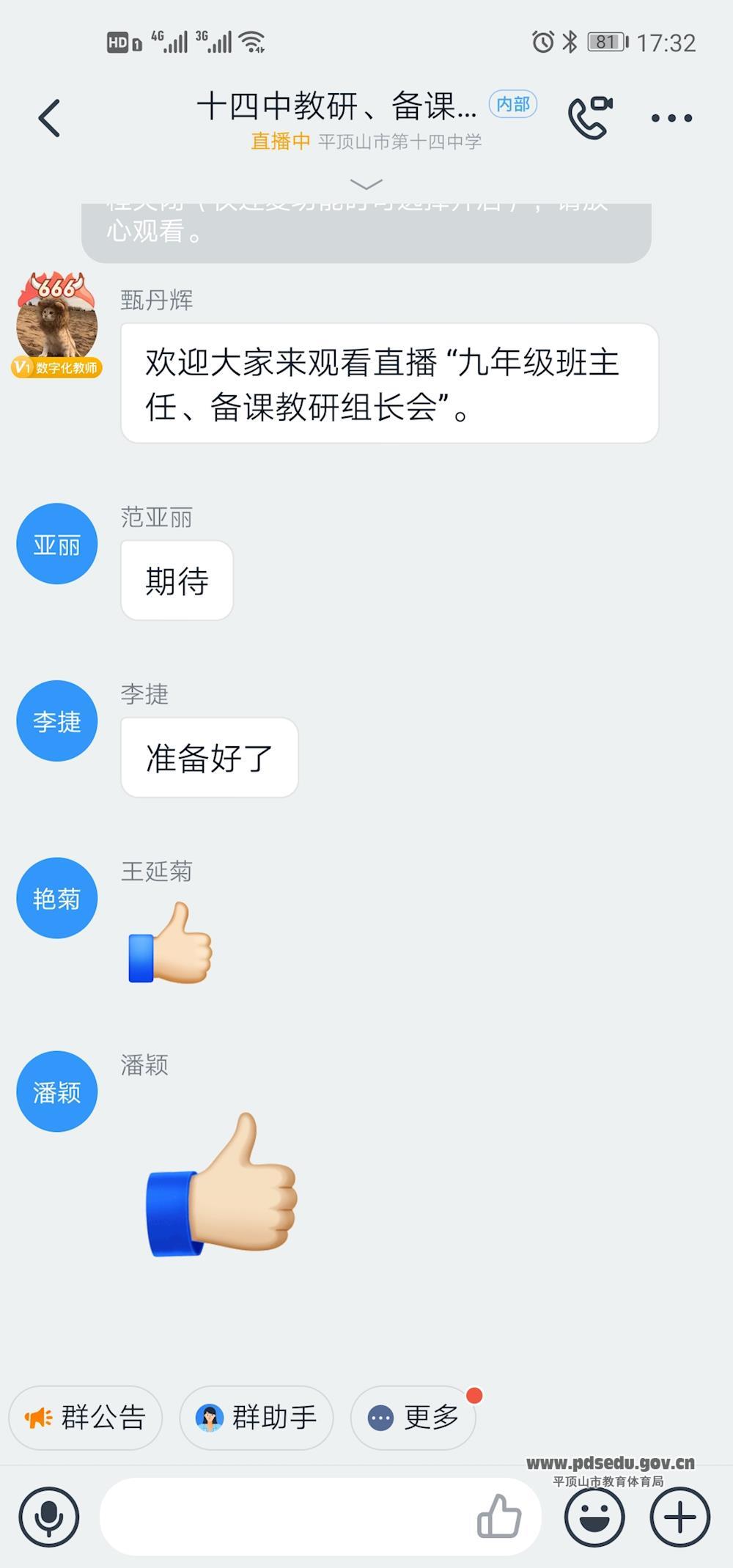 2020年疫情以来,按照上级安排,市十四中的线上教学已经进行了整整四周,九年级全体师生共同在钉钉群上进行了近一个月的线上学习。3月5日下午,市十四中校长万邦浩在钉钉上对全体九年级班主任老师、九年级学科备课和教研组长进行了一次线上直播。