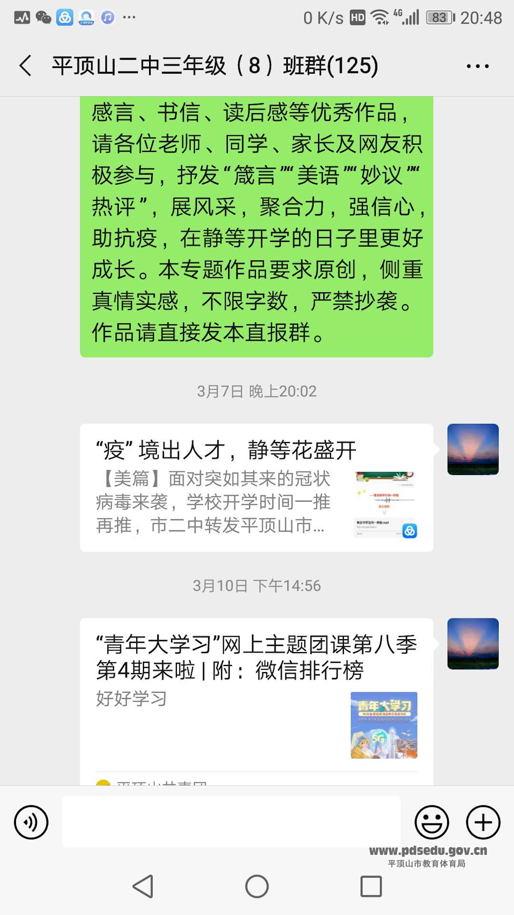 由于受疫情影响,学生在家看手机学习,整天憋闷在家里,眼睛盯着手机看,课堂作业多,心理压力大,身心疲惫,心情郁闷,烦躁等。在线上教学的过程中,不断有老师反映,学生逃课、翘课、作业拖沓或不做,家长劝说无效,甚至和家长闹别扭,有冲突。出现多种厌学现象。为了给学生减压,认清形势,提高学习动力,年级利用每周日召开一次主题班会,携手科大讯飞等平台,推送清华励志视频和特级名师备考公益课等,进行励志教育、时事教育、安全教育和心理健康教育等。