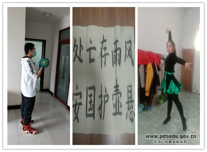 这次疫情也让大家认识到了身体的重要性。学习之余,同学们在有限的条件下以不同的形式进行锻炼,以保证有充沛的精力,有时也会拿起画笔或毛笔,画画画,练练字,以自己的方式表达对祖国的热爱。