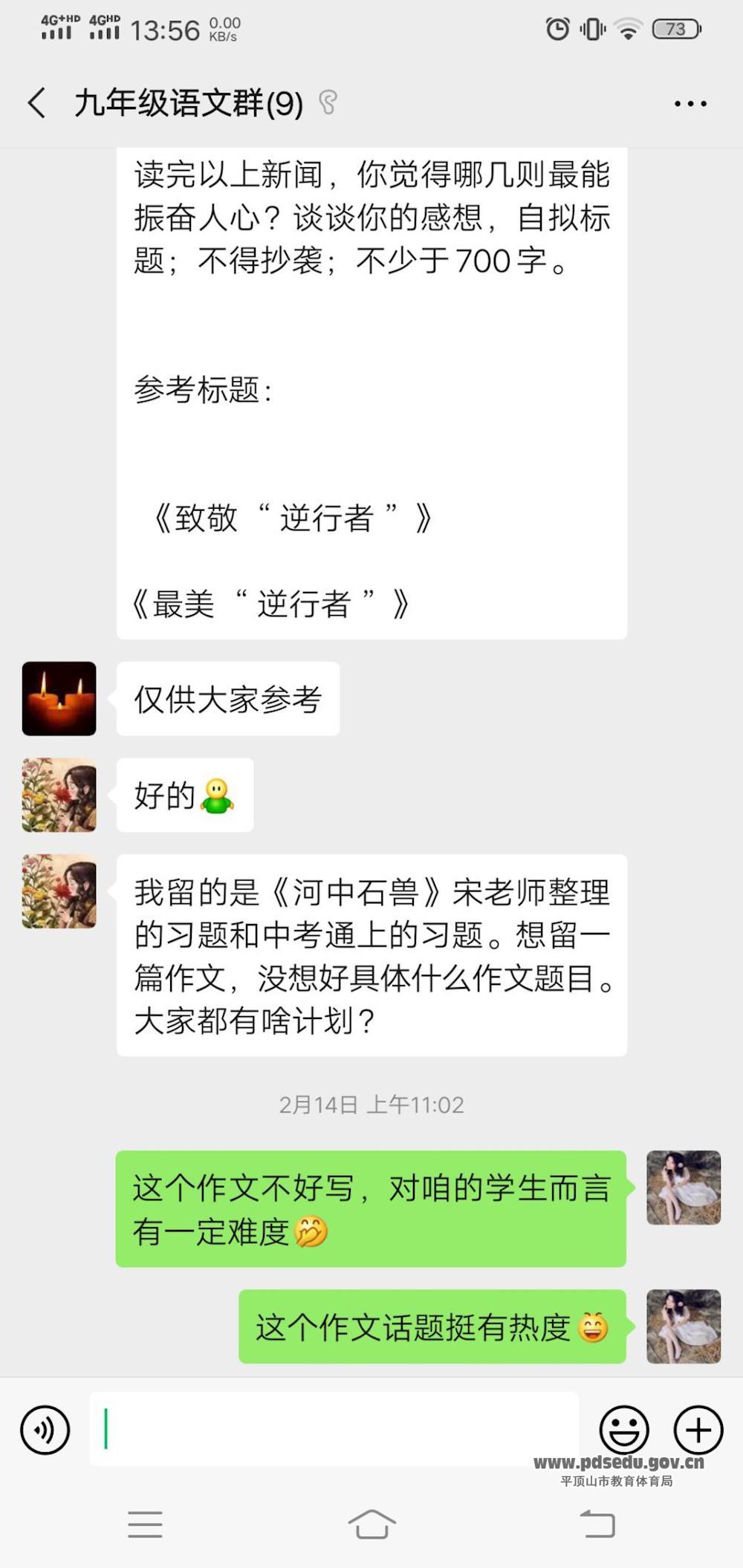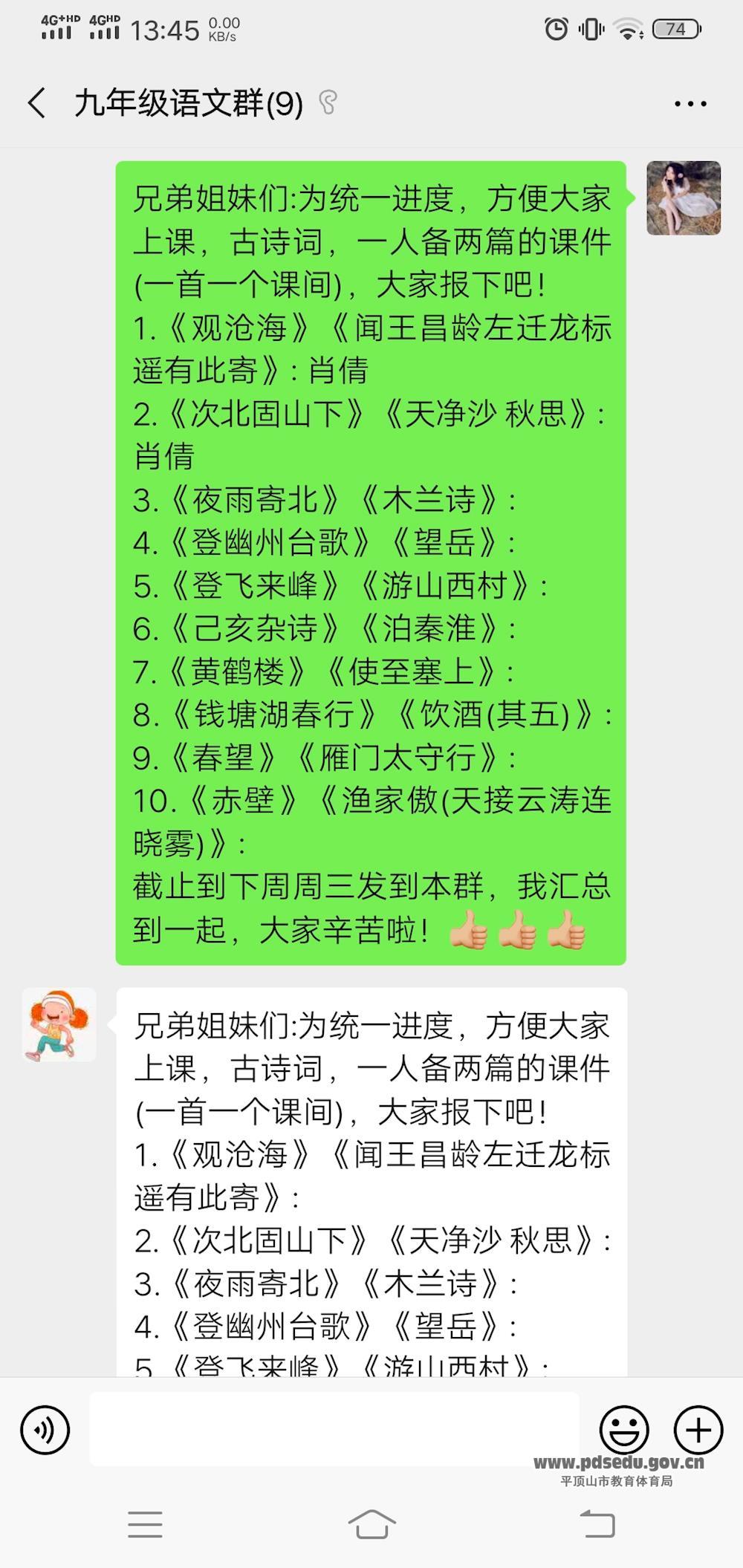 第二步:研讨教学课程,语文教师们认为,线上教育确实削减了面授的深度,但是却扩大了授课的广度。将劣势转换为优势,可以让学生们接触不同类型的学习和思路。语文教研组一直以“团队战”闻名,当下的课堂变成了眼前一块几寸大的屏幕,但是眼界必须要比以前更加开阔。九年级语文组的老师们,面对巨大的中考压力,始终坚信“不忘初心,方得始终。”老师们按照中考大纲进行分模块复习,化零为整,易总结好把握。语文组每周,甚至每天都会利用微信等网络平台研讨教学,共同备课,统一进度,查阅资料,设计出题,统一作业。在群内布置相应的练习题,授课后留的作业讲求“少而精”,也给第二天的讲评留下充足的时间。线上授课讲练结合,给学生足够的自主学习时间。课下也通过“钉钉”“微信”等平台和家长沟通,并对学生进行答疑解惑。