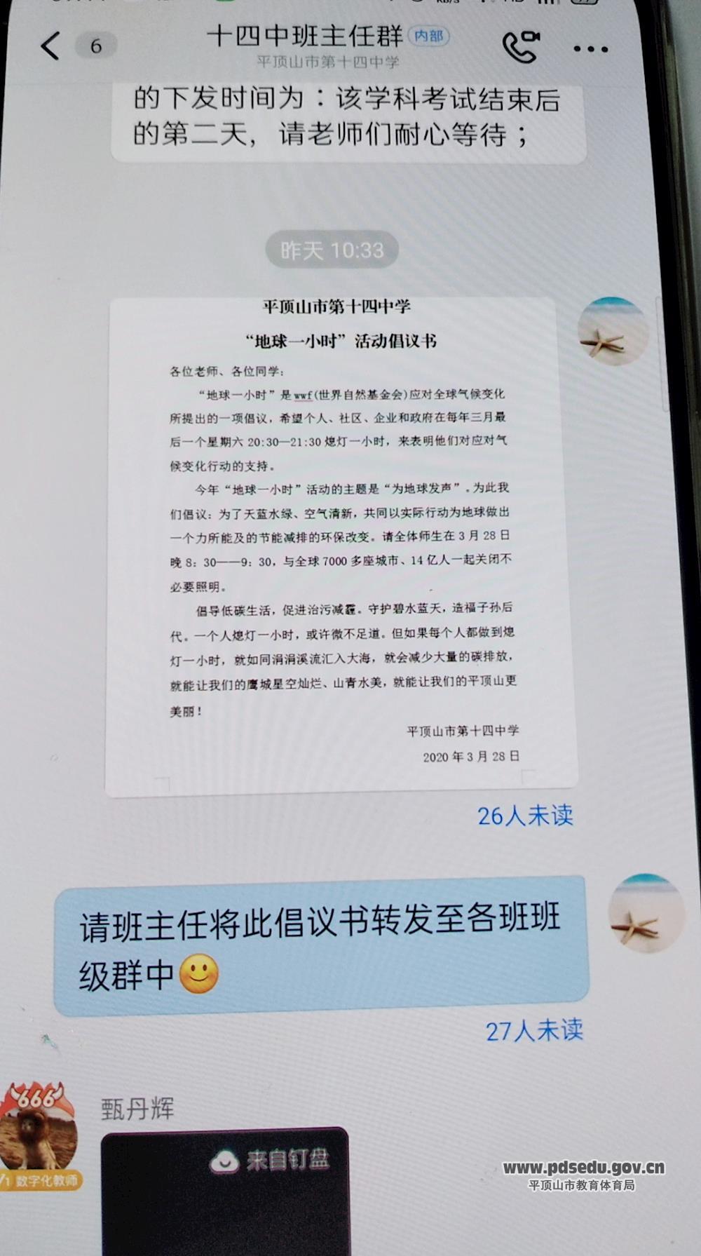 3月27日,市十四中通过电子屏滚动播放和线上平台宣传等多种形式向全校师生发起活动倡议,倡导大家熄灯一小时,以增强广大师生对节约能源的意识,倡导低碳的生活生产方式。