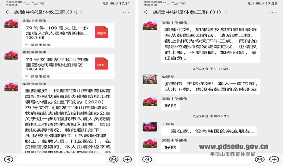“熊主席,我们一直呆在家里”,“熊主席,我们一定配合好学校的工作”,“我们坚决不信谣、不传谣”……这些退休教职工们的觉悟和热情使我们非常感动,让我们更有信心守护好这块责任田,确保他们的平安健康!