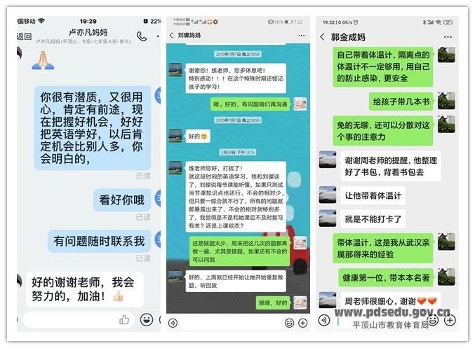首先感谢班主任老师们的辛苦付出,在网络上管理班级,一点也不比在学校轻松。疫情前期,同学们需要填各种各样的表格,班主任们把要填的表格模板发到微信、钉钉群里,即便如此,有的学生还是填错,老师不厌其烦地耐心指导,直到学生们全部填对填完为止。每天任课老师直播上课,总有几个学生不认真上网课,要么不听课,要么听课时间短,作业完成不及时也时有发生。看到这种情况,班主任们甚是着急,她们通过线上班会,线上家访等活动,加强家长合作,保证同学们的学习质量。