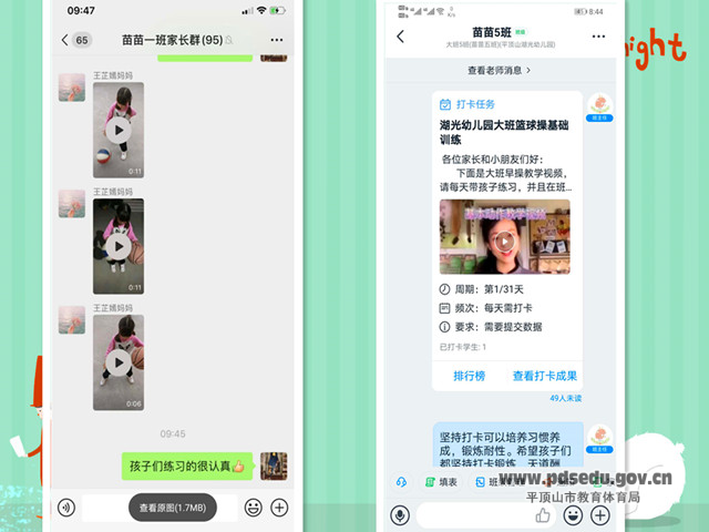 各班老师将拍摄的视频发到班级群,督促家长指导幼儿坚持锻炼。老师们还通过班级打卡的方式,对幼儿的视频图片及时评价指导,让幼儿在家也能进行正确的体育锻炼。