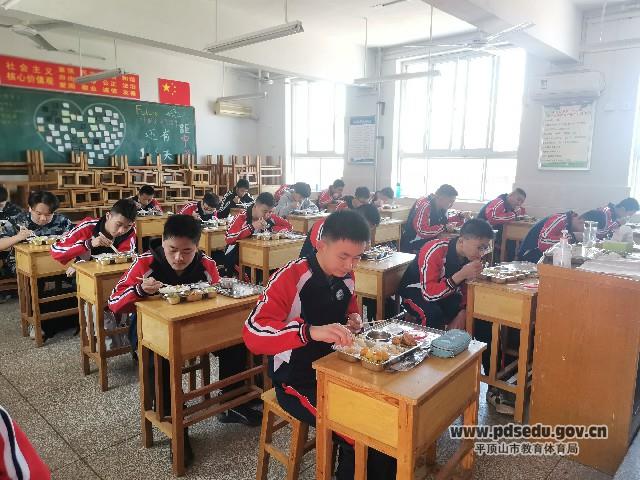 中午统一配餐,学生在教室安静有序就餐,午间安排自由活动和休息时间。下午放学,各班错时有序离校。学校层层把控,对学生在校期间的“吃、行、学”做了周密细致的部署安排,让学生安心而不分心,集中而不拥挤。