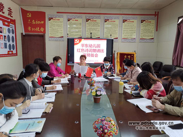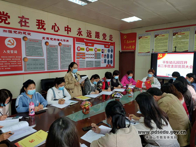 5月10号上午,平东幼儿园全体党员在鸿鹰园党员活动室召开了第二季度支部党员大会暨发展党员民主测评会,活动由党支部书记赵惠芳主持,全体党员参加会议。