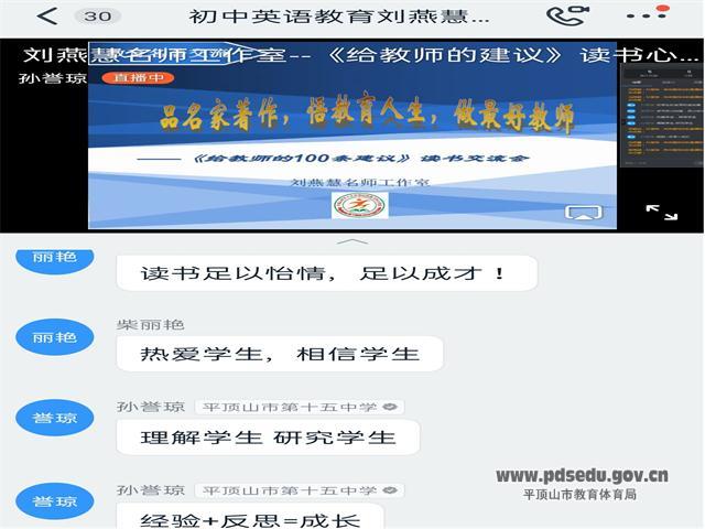 读书是促进教师成长的重要途径,教师的精神成长,需要高品位阅读的滋养;教师的专业发展,需要经典专著的引领。为了进一步提高教师文化素养,促进教师专业发展,6月3日下午,刘燕慧名师工作室成员在名师工作室举行了读书心得交流会。此次读书分享会的主题是“品名家著作,悟教育人生,做最好教师”。受疫情影响,本次分享会采取线上直播与线下互动的方式进行。