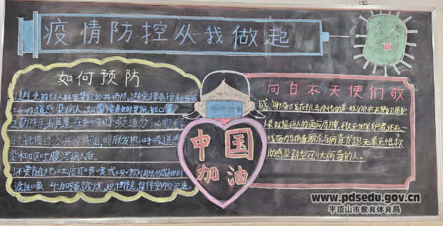 同时学校各班办理了一期“防疫知识”为主题的黑板报,各位班主任老师和学生共同收集素材。黑板报设计合理,内容丰富,既有防疫小知识,又有致敬逆行者,还有为中国的强大而自豪。