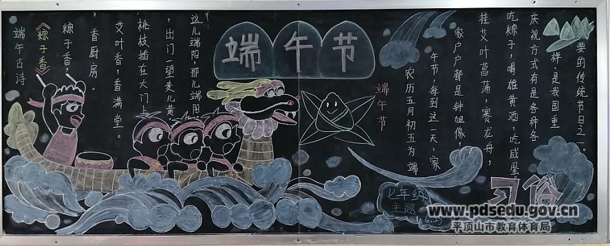 各班在周一还完成了以“端午情”为主题的黑板报,在同学们的画笔下,一幅幅生动的图像、一句句有情的话语展现在教室后的黑板上。同学们利用黑板报这块阵地,表达了对节日的美好愿望。