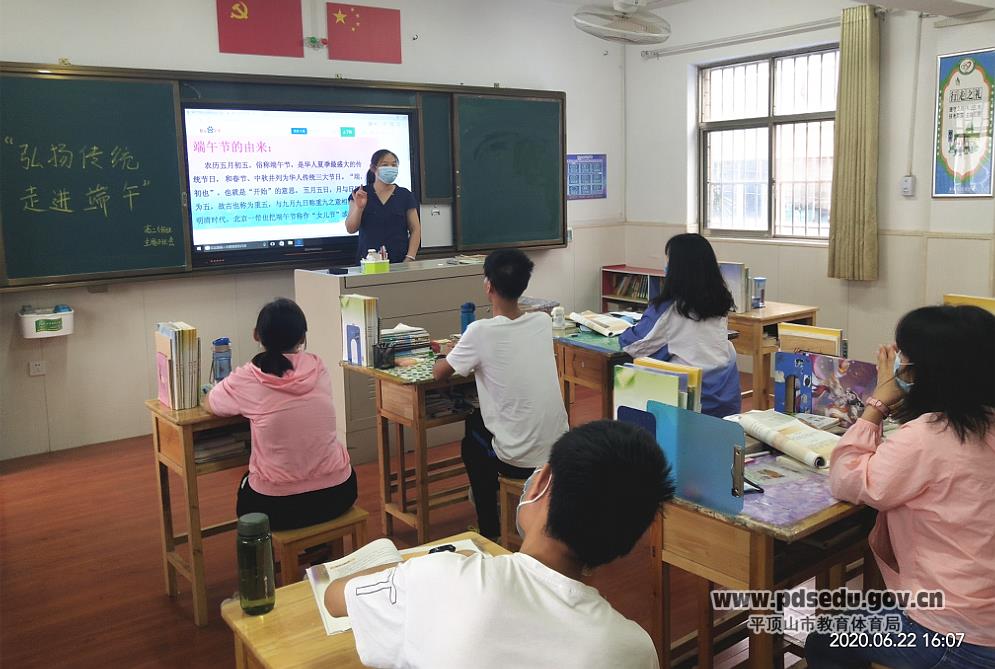6月22日下午,各班组织开展了“弘扬传统 走进端午”主题班会。班会上,班主任老师向同学们介绍了端午节的由来,讨论了端午习俗;高年级学生还进行了有关端午诗词大比拼;同时老师还通过该班会,给同学们进行了爱国主义教育,教育他们要把我国的传统节日予以传承、弘扬。