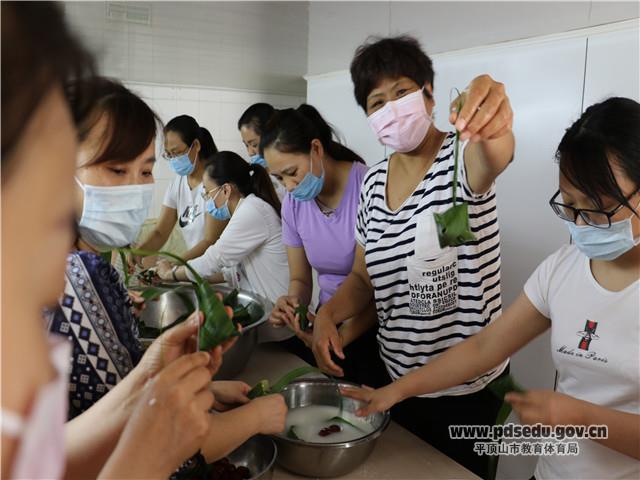 教师包粽子比赛现场摆满了粽叶、糯米、蜜枣等材料,随着计时员的一声令下,包粽子比赛正式开始。只见老教师们动作娴熟地拿起粽叶卷成漏斗状,填米、压紧、扎绳、一气呵成。年轻教师也虚心向老教师们学习,很快领会了其中的窍门,一个个包得有模有样。大家纷纷表示,通过这种活动,既传承了传统技艺,又切身感受到了浓浓的节日气氛,很有意义。