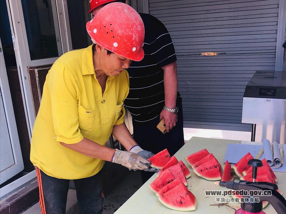 6月25日,正值端午佳节,市十四中校长耿保峰为综合教学楼校安工程工地的工人们买来了降暑的西瓜,并亲自送到工人手中。