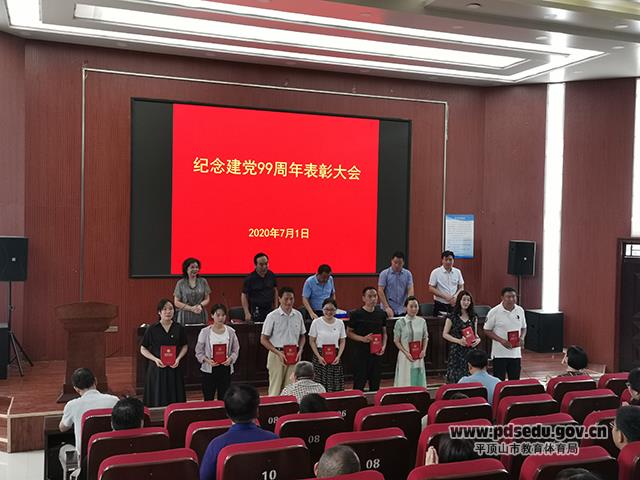 随后,表彰在2019-2020年度学校工作中表现突出的优秀党员,他们有的在各自平凡的工作岗位上严于律己,率先垂范,做出了不凡的工作业绩;有的是在市教体局“中华人民共和国成立70周年‘我为党旗添光彩’”演讲比赛中脱颖而出的优秀党员。党委委员、副校长张广民向“七一”建党节受表彰的优秀党员和红色诗词朗诵比赛中优秀选手颁发证书,号召广大党员同志以先进模范为榜样,立足本职,努力工作。