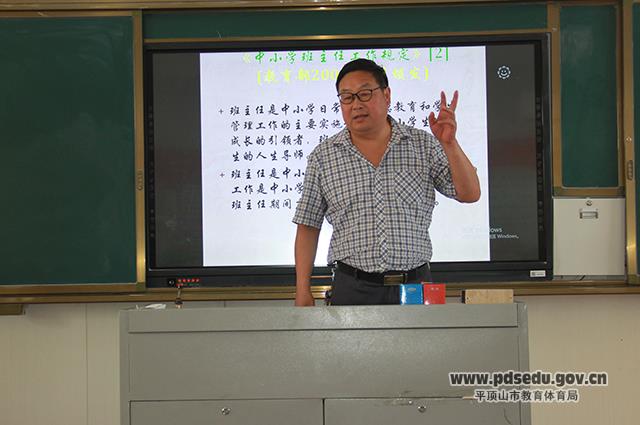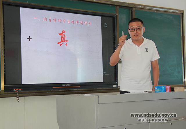 张晓东从介绍家乡小山村的变化,家乡的春夏秋冬美如画入手,进入主题班主任的职责;班主任对学生的共同特点;班主任就是学生在校的家长;班主任是家校沟通的桥梁;班干部的培养;班主任管理的“粗”与“细”;如何培养全班的学习氛围;理想道德教育;与任课老师沟通…张老师有理论有实例,结合自己的亲身经历深入浅出的娓娓道来,课堂上时而鸦雀无声,时而欢声笑语,交流顺畅。张老师语重心长地说:“要像经营家庭一样的来经营班级。”