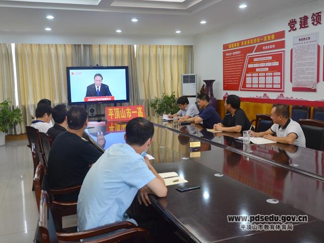 7月29日下午3点,市一高党委组织中层以上党员干部在校会议室集中收看“2020年‘双百’活动中央和国家机关专场报告会”直播。校党委副书记、副校长李德权主持会议。