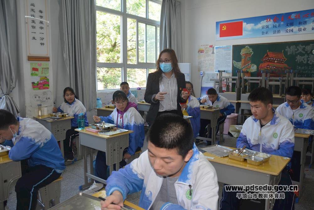 12点,按照广播提示,班级错峰取餐。听到广播后,每班8位同学有序下楼排队抬饭盒,中午就餐时,没有人喧闹,安安静静的就餐。景艳伟深入到初三各个班级询问学生饭菜质量,叮嘱学生饭前一定要洗手消毒,注意个人卫生。