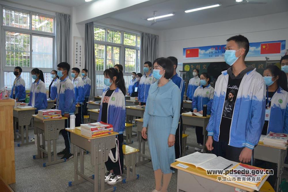 学生进班后,一场特殊的开学升旗仪式开始了。伴随着雄壮的《义勇军进行曲》,鲜艳的五星红旗迎风展开,缓缓升起。初三全体师生在班级观看升旗仪式直播,行注目礼。随后,校长景艳伟致辞,欢迎九年级全体师生安全返校,叮嘱同学们,今天的复学来之不易,永远不要忘记替我们负重前行的逆行者和英雄们。同时,景艳伟要求同学们严格服从疫情防控相关要求,做好个人防护。最后,她希望同学们能在这个春暖花开的美好时光里,按下努力拼搏的“快进键”,不负韶华,放飞梦想。