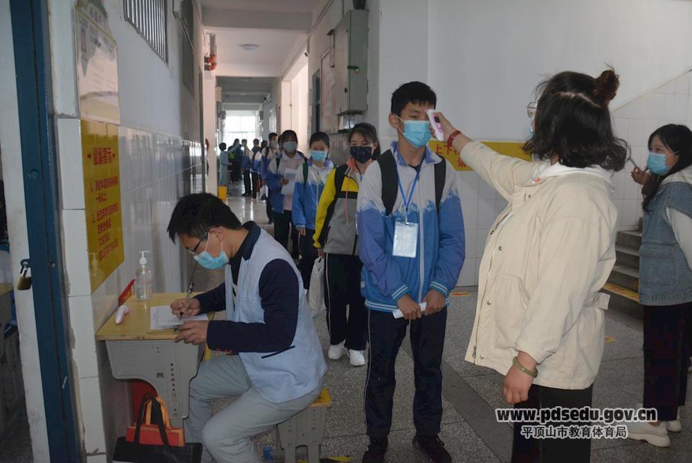 上午7点开始,初三学生根据错峰上学的时间安排,先后来到学校,依次排开,间隔一米左右距离,接受老师的体温检测后,开心地走进向阔别数月的校园。