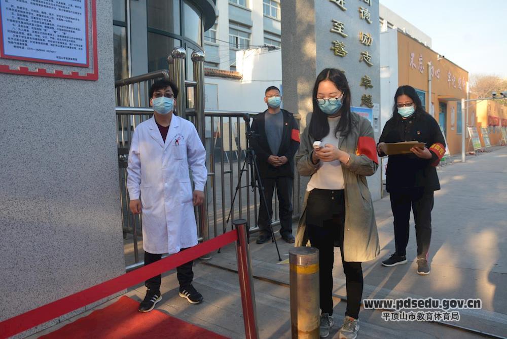 早上,校门入口处的体温监测通道早已经搭建好,安检设施一应俱全,老师摇身变为防疫员、安检员,对进入校园的师生们逐一进行体温测量。学校领导全部在校门口迎接同学们的到来。